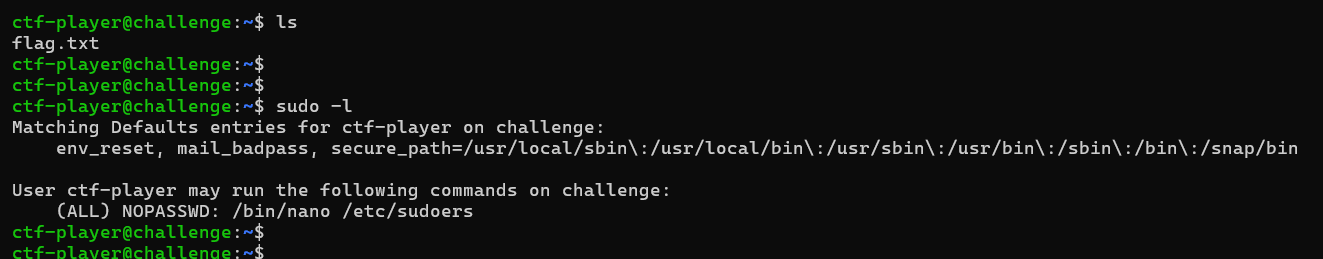 As you can see, the file `flag.txt` is owned by root. The question now is: how can we read it as a regular user? This is where `sudo` becomes useful. Let’s check what commands we are allowed to run as root using `sudo -l`.