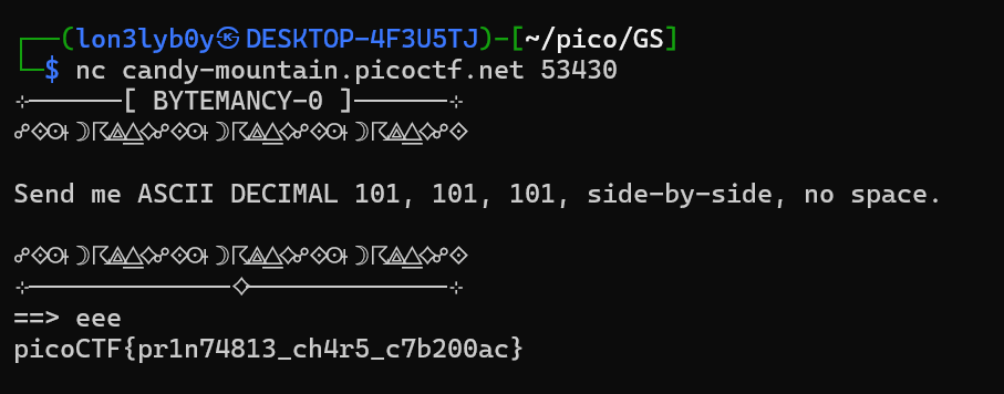 Take a closer look at the condition, `"\x65"` is **hexadecimal for 101 in decimal**, which corresponds to the ASCII character `'e'`. Therefore, `"\x65\x65\x65"` is the string `'eee'`. All we need to do is to type `'eee'` and the program will provide the flag. Now let's connect to the server: