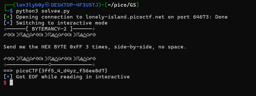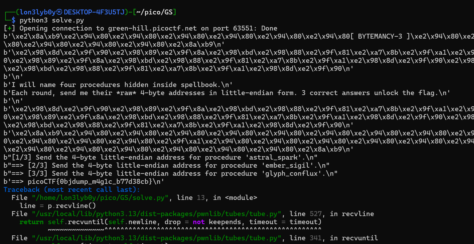 We've got the flag, the error is just EOF, because the connection closed but our script still trying to recv:>>