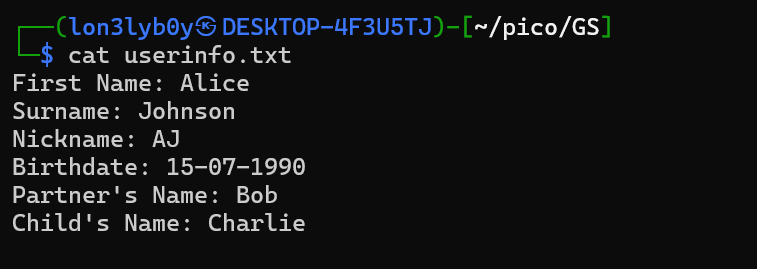 So it's full of credentials about `Alice`, according to the hint, we can utilize the tool `cupp` to make a wordlist. `cupp` is a wordlist generator, it uses provided credentials of the target to craft the possible passwords.