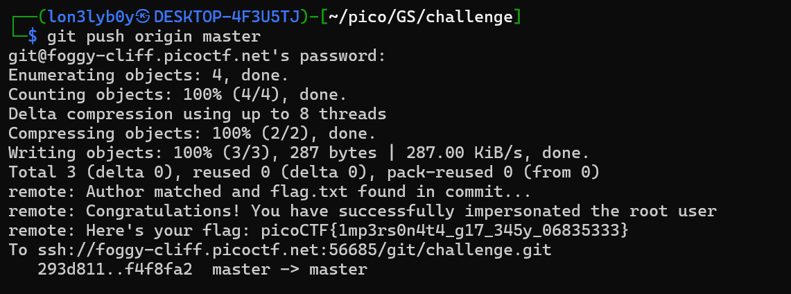 This means the server **only accepts commits made by a user with username `root` and email `root@picoctf`**. So we need to **pretend to be that user locally**, push a commit with `flag.txt`, and then the server will reveal the flag.