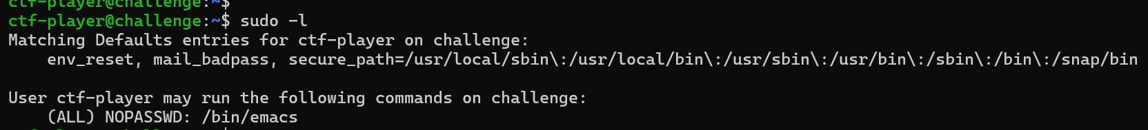 Since the `sudo -l` command shows that we are allowed to run **emacs** as root, we can use it to access files that normally require root privileges. **Emacs** is a powerful text editor in Linux that can open and view files, similar to nano or vim, but with more advanced features. Because we can execute emacs using sudo, it will run with root permissions, allowing us to open the protected `flag.txt` file even as an ordinary user. By running the command `sudo emacs flag.txt`, the file will open inside emacs, and we can read the flag even though the file is owned by root.