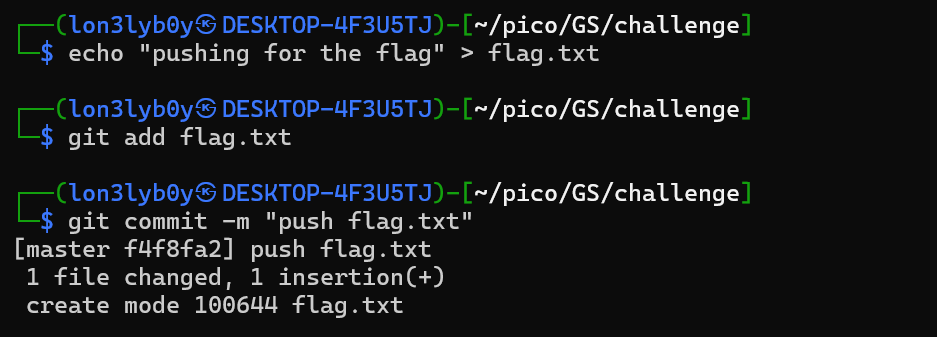 `git commit -m "push flag.txt"`