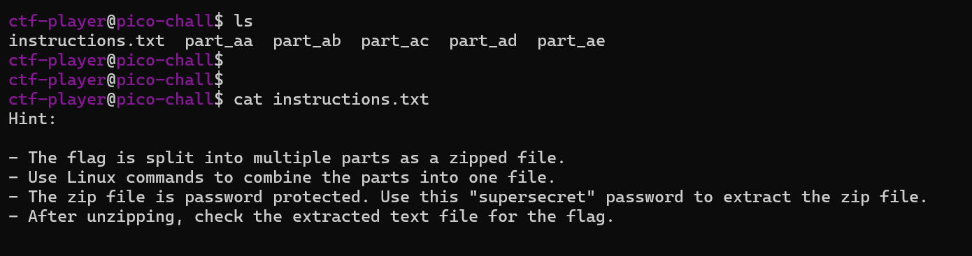 `cat part_aa part_ab part_ac part_ad part_ae > flag.zip`&#x20;